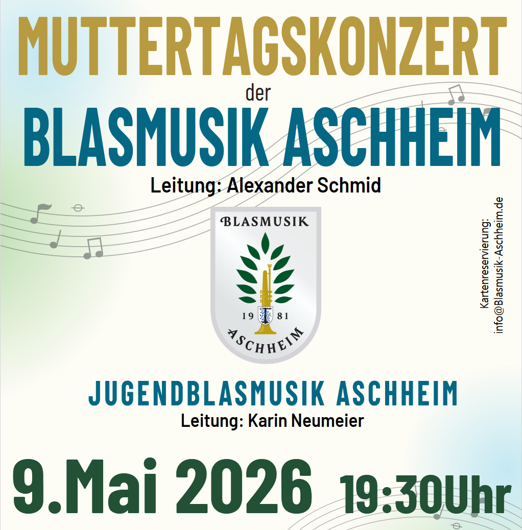 Muttertagskonzert 2026 Die Blasmusik Aschheim freut sich alle Bürgerinnen und Bürger am Samstag den 9.5.2026 zu unserem traditionellen Muttertagskonzert zu begrüßen.