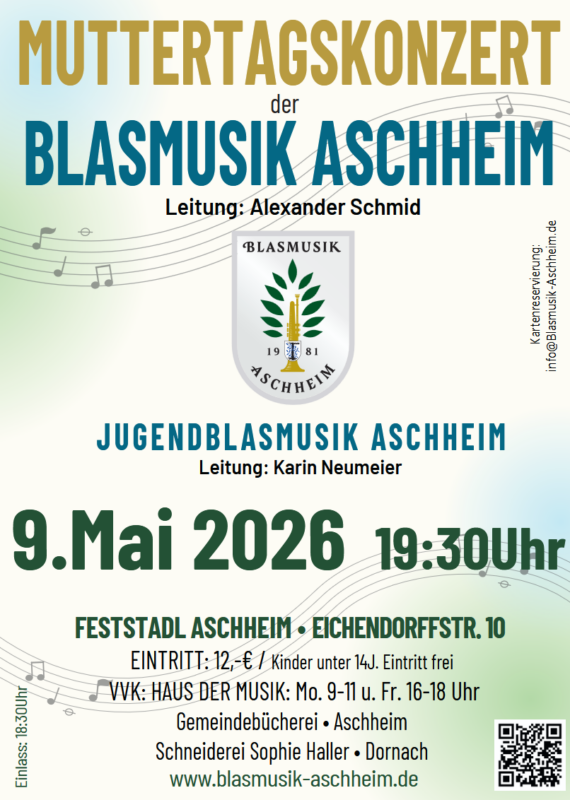 Am Samstag, den 9. Mai 2026 veranstaltet die Blasmusik Aschheim wieder ihr traditionelles Muttertagskonzert. Beginn ist um 19:30 Uhr im Feststadl in Aschheim, Eichendorffstraße 10.